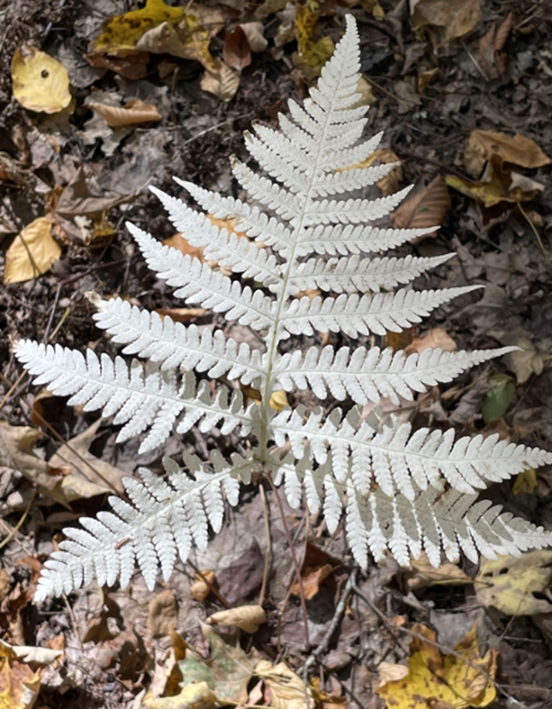 The Broad Beech fronds are the best Ghost ferns, because they hold their shape well for a long time and are often a strong pure white instead of just pale or yellowish color like many other Ghost ferns. To aid those who are interested in learning how to identify Ghost Ferns, I have created 4 pages of labeled photos of Ghost Ferns Randy and I have photographed. I must warn you, if you are interested in identifying Ghost Ferns, you are on your way to becoming a member of my Dead Fern Society! You can find the photo pages on our PVFS website under Downloads, Fern Photos Selection. I will try to attach or link the first page to this news article, as an example.